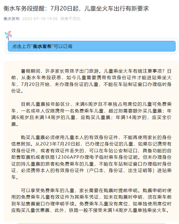 最近,衡水发布、金华发布、成都发布等官方公众号均就此发布了出游提醒:7月20日起儿童(含免费乘车儿童)乘车时必须携带有效身份证件才能进站乘车,忘带儿童实体身份证了,家长可在火车站人工售票窗口办理临时身份证明。但如儿童未有实体身份证,则无法办理临时身份证明。