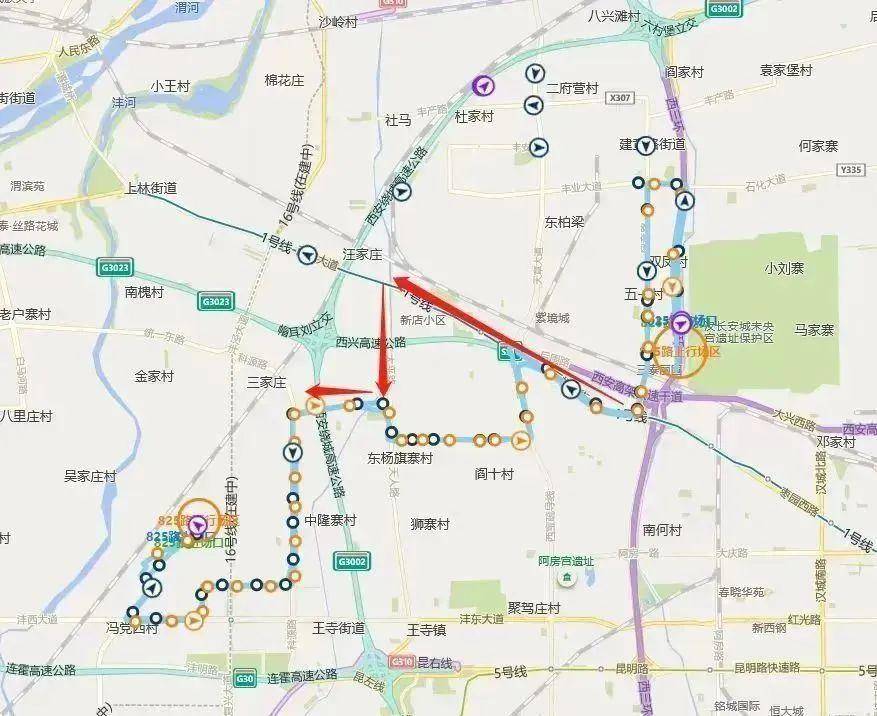 825路自东雁雀门村运行至建章路,过三桥西走世纪大道至沣东自贸地铁站左拐至宁泰路恢复运行。
