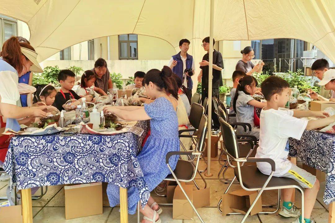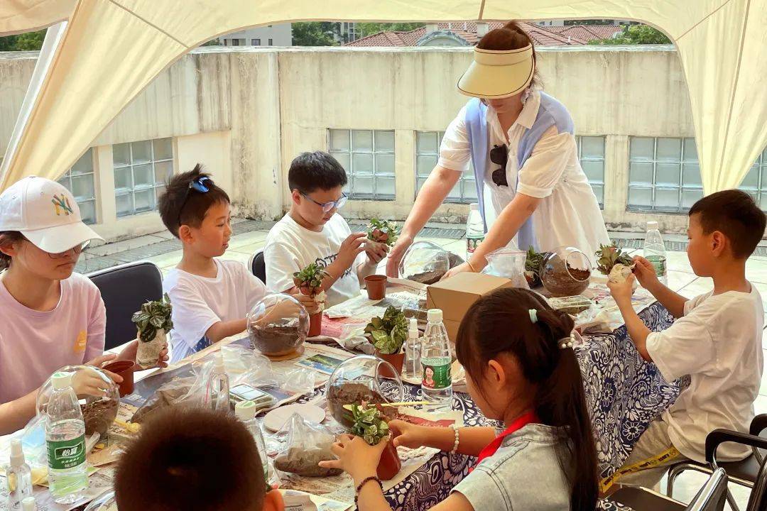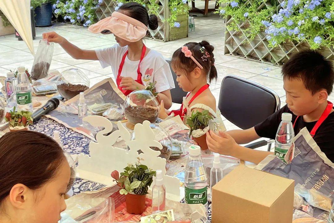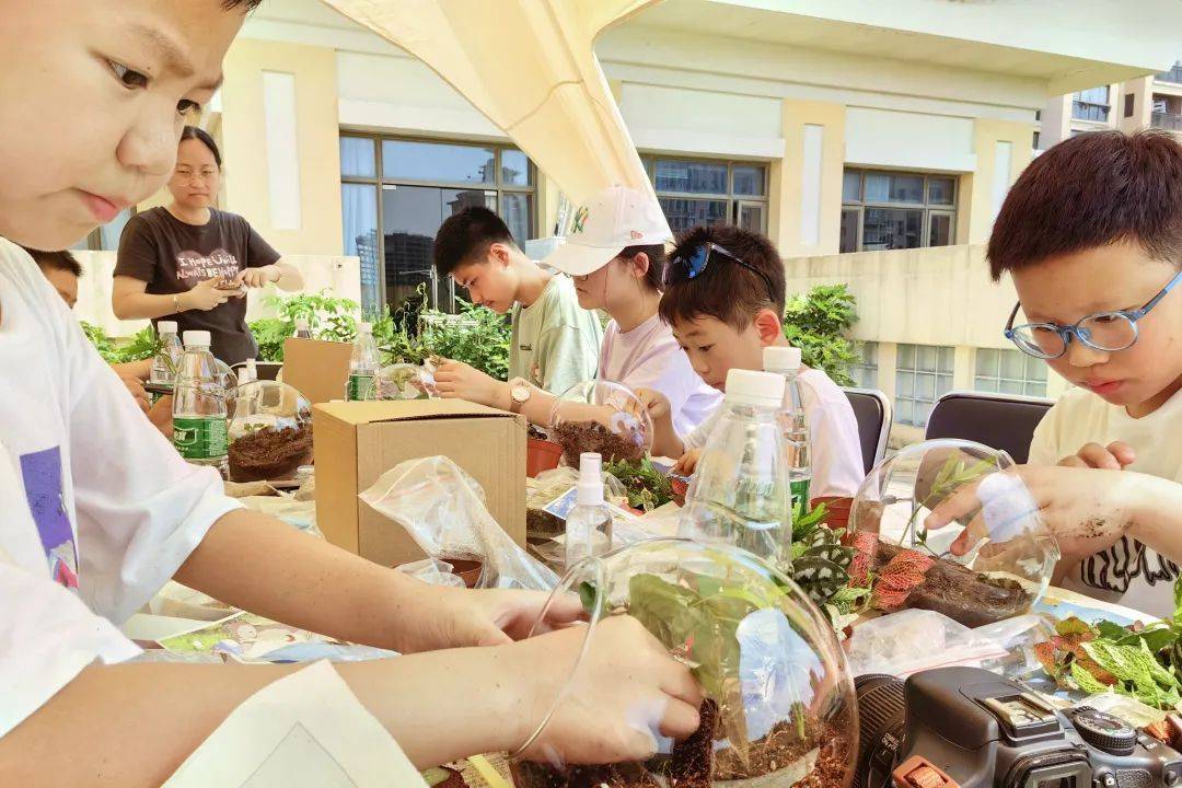 小小的玻璃瓶,如何演化出绿意盎然的微景观。“先倒入可以调节水分的轻石,接着放入水苔,它能保证养分的储存,然后慢慢地倒入营养土,再把网纹草、苔藓等植物放进去……”孩子们跟随指导老师遨游在微景观的世界里。