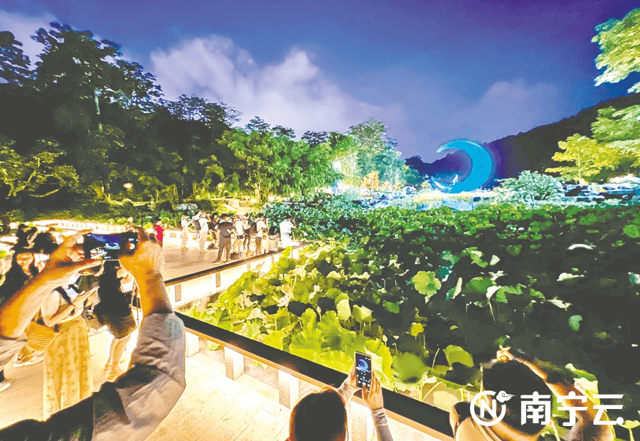 青秀山桂花园荷塘夜色中的歌舞表演引来众多游客。记者 潘浩 摄