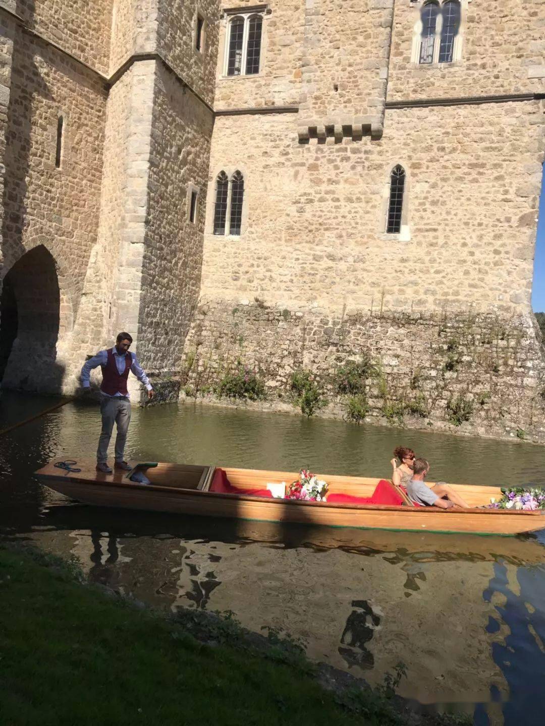进入这个门之后,是一个很小的小院子,可以进去上个厕所休息一下。然后便进入漫长的等待中,美丽庄严的城堡下站满了等待的人们,那长长的队伍一眼望不到尽头,大家都很安静的等待着,英国人的排队功夫是从小就练出来的,人们都翘首期盼着走进城堡的那一瞬间被花海包围着...不远处一外国小哥划着船从我们的队伍经过,小船居然也用鲜花装扮了一下,一对男女坐在小船上聊天,那叫一个浪漫哦!