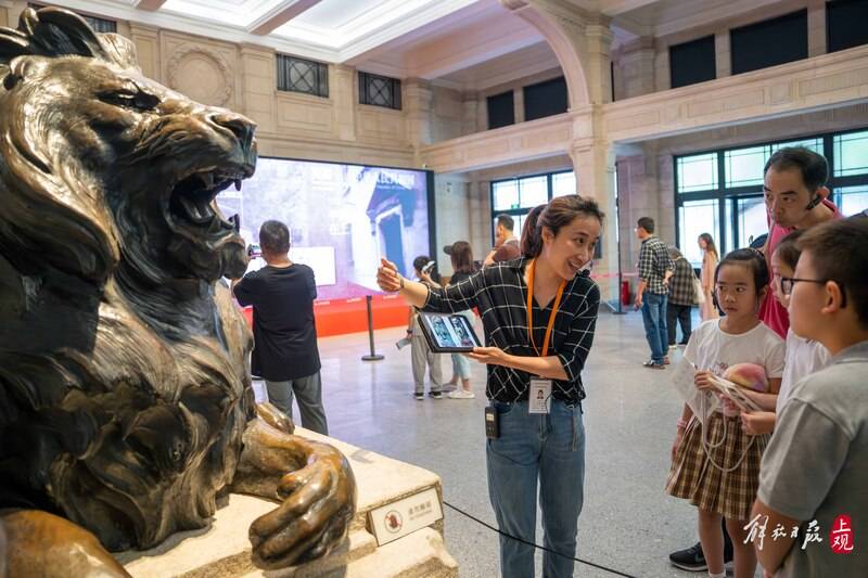 一楼的展品中,两尊威武的铜狮特别引人注目。“这两只狮子看起来是不是有点眼熟?平时我们看到的狮子雕塑一般会摆在哪些地方?”徐旦旦抛出问题,让孩子们思考片刻,随后开始介绍雕塑的来历。原来,早在1923年外滩汇丰银行大楼落成典礼之时,这对威武的铜狮就被安放在银行门口,有镇宅辟邪和守财的寓意。两只狮子的嘴巴一开一闭,象征着银行放贷和存款业务的一出一进。现在,这两尊铜狮已成为上历博的镇馆之宝,被称作“汇丰狮”。