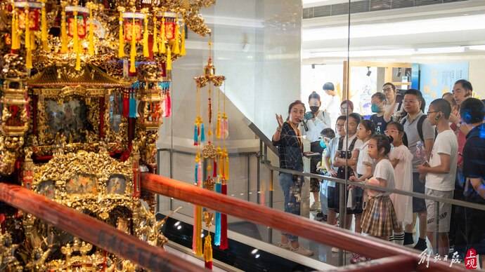 在经过上历博又一“馆藏重器”——物华号百子大礼轿时,家长和小朋友们的目光都被其牢牢吸引住。通体雕刻精美繁复、流光溢彩的轿子凭借外表,先声夺人。“礼轿通体雕刻花鸟鱼虫、仙禽瑞兽、民间传说、戏曲故事,处处包含吉祥寓意。轿身上原有100只小电珠,据说是10名木雕工匠耗时10年完成。你们猜猜,这座轿子能不能坐人?如果可以坐,人从哪里进?……”这个问题又考住了研学团的成员们,大家左看右看没有确定的答案,当徐旦旦解开其中的奥妙时,大家不由一边惊叹,一边更仔细地观摩起轿身之精妙。