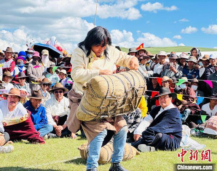 图为草原汉子举沙袋。 卓太才让 摄