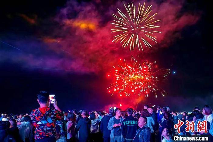 烟花秀表演中,各式烟花不断升空、流光溢彩,点亮盛夏贡宝拉格草原的夜空。
