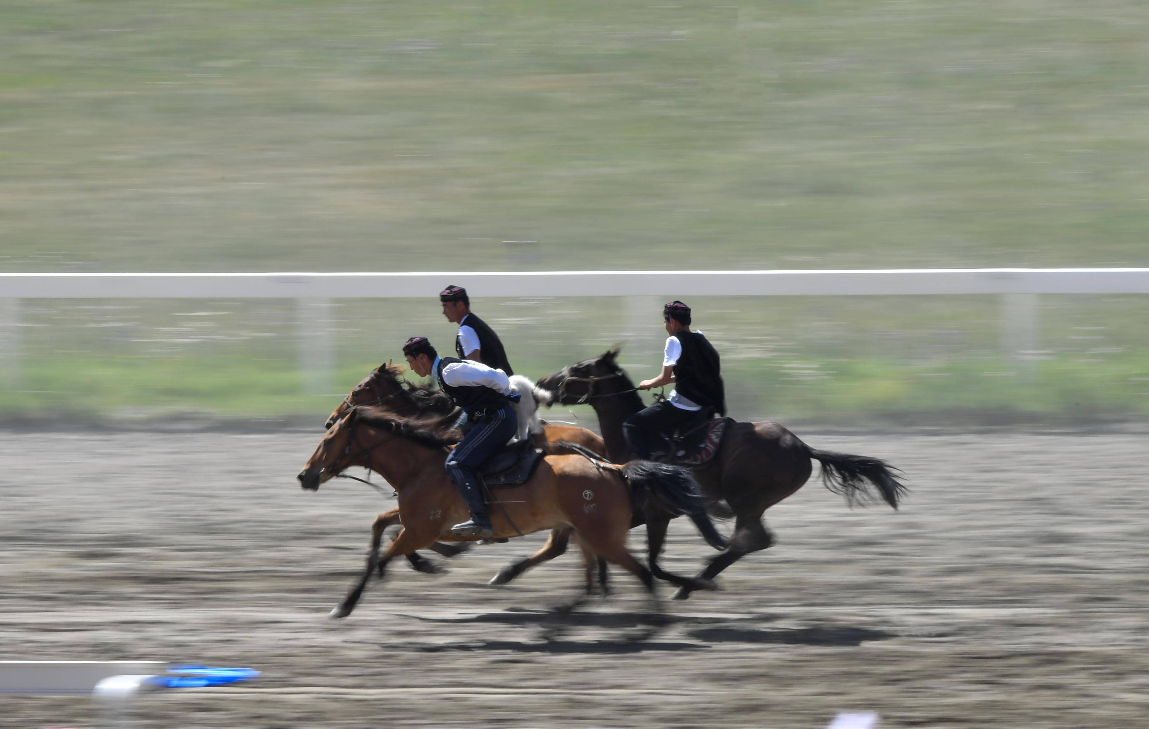7月16日,牧民在开幕式上表演“叼羊”。 新华社记者 赵戈 摄