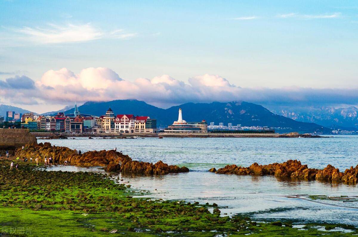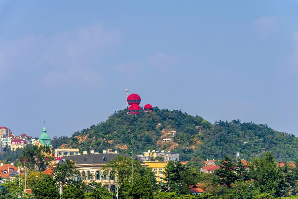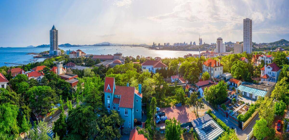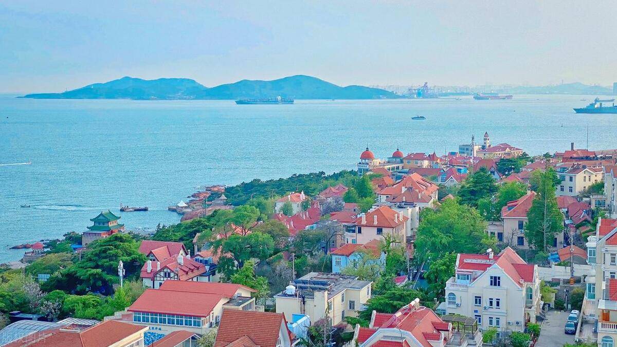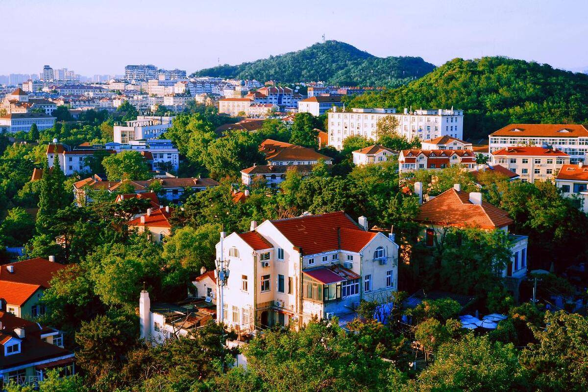小鱼山虽不高却能远眺,登山俯瞰,栈桥、小青岛、鲁迅公园、汇泉湾、八大关景区,海美景尽收眼底。落日的余光洒在红房子的瓦上,房顶闪着微微金光。上到顶处的览潮阁,又能看见更加美丽广阔的大海。