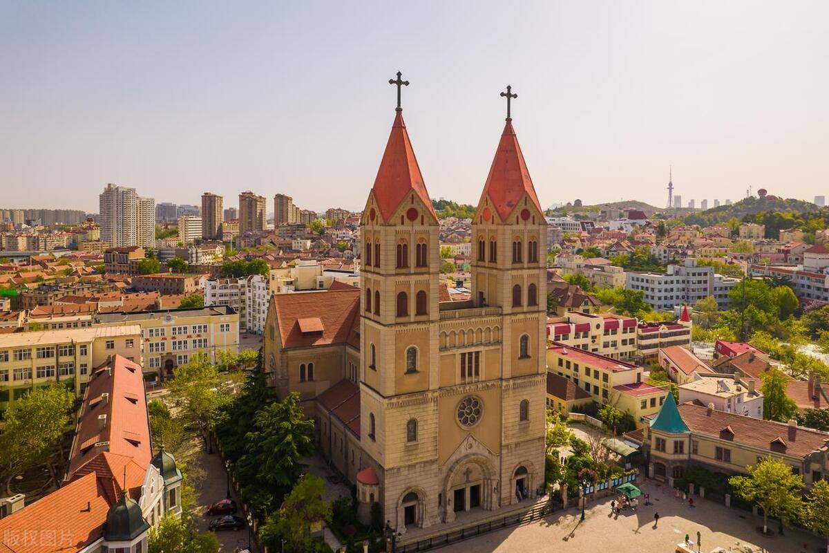 青岛天主教堂本名圣弥厄尔教堂,塔身高56米,是建国前山东省最高的建筑。淡黄色的墙体,粉红色的屋顶上立着端正的十字架,圆拱形门扇,红色窗棱,简洁优美的图案。教堂很高,内部通体白色。上方穹顶绘有精美壁画,玻璃窗也布满彩绘。