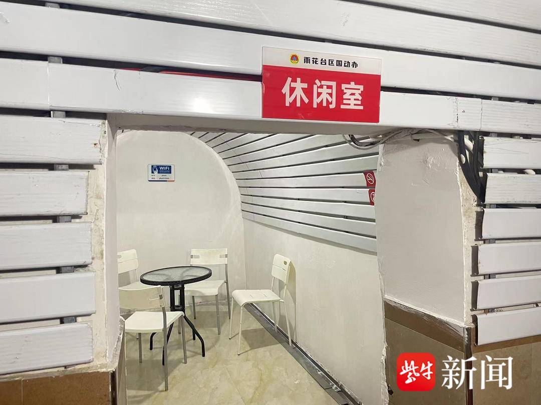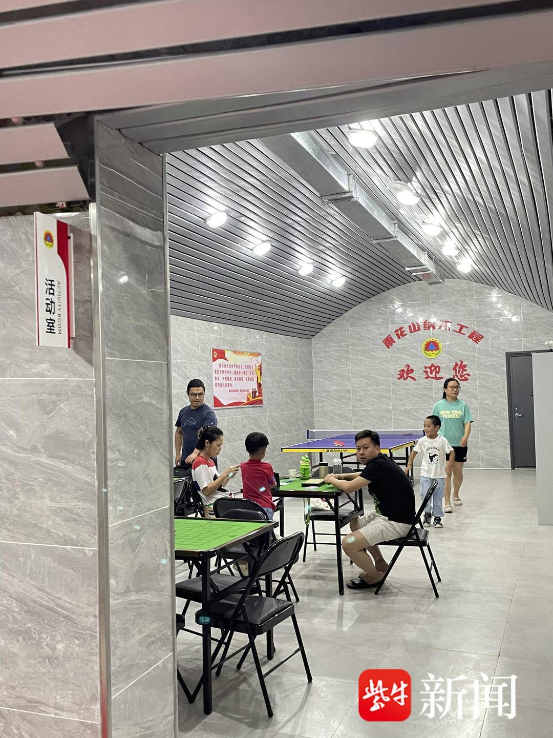 深深的洞里,窄窄的廊道,显得特别安静。墙上装有盏盏壁灯,灯光把洞内照得很亮。记者去的时间没有碰到居民,都是前往雨花台烈士陵园的游客。“在外面太热了,进来歇歇脚。”来自安徽的游客李先生一家说,本来以为里面就是个山洞,没想到进来后看到有休息室,里面摆放桌椅,还提供免费无线上网,“居然还有棋牌室,真是个游客的宝藏纳凉场所。”