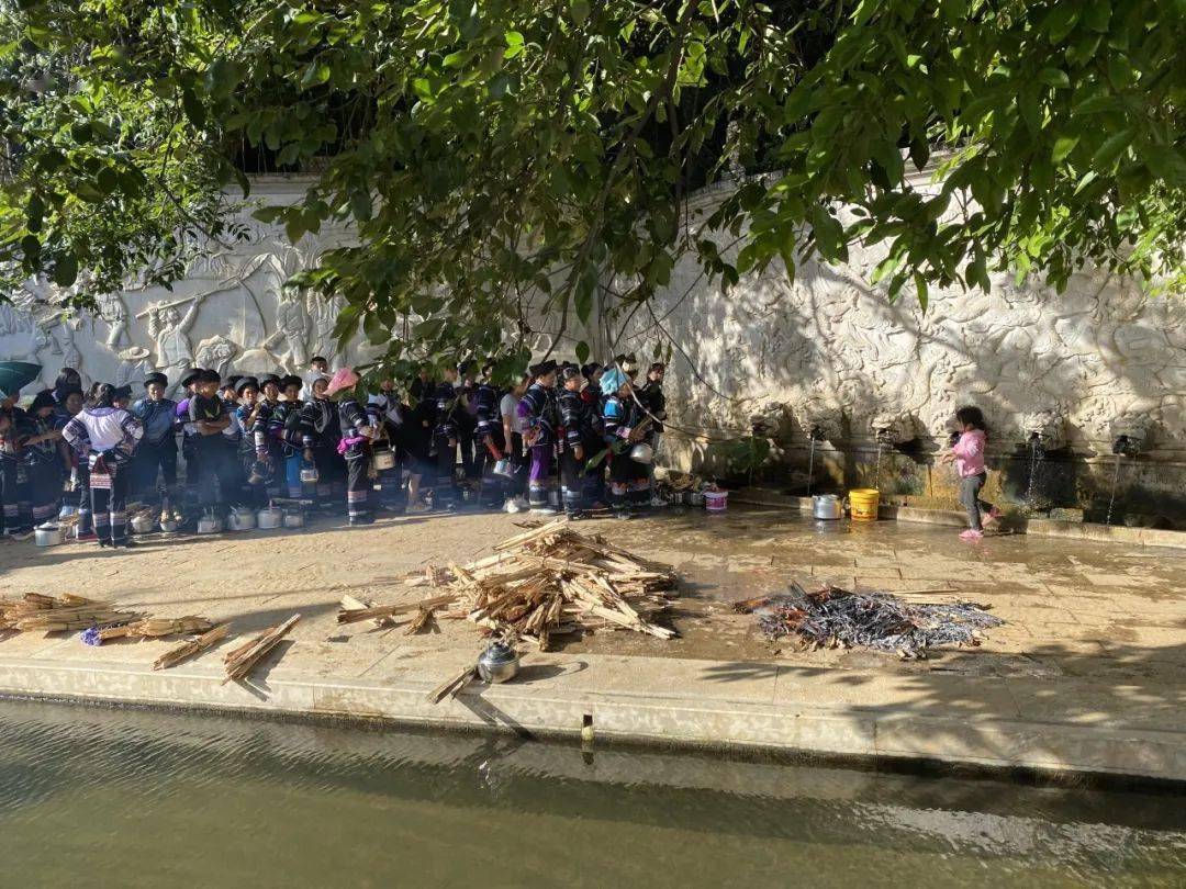 UTV是4座的,由工作人员驾驶,飞驰电掣在那条泥泞的羊肠小道上,我着实还是紧张了一把,连连要求“慢一点,慢一点”直到拐上了去镇上的公路才放松地享受两边一路后退的美景和沿途路人羡慕的眼光。到了镇上,看见当地妇女都换上了节日的盛装,戴着特别的头饰,拎着水桶排队等待吉时的到来,不排队的妇女则围成一圈边唱边跳,好不热闹。