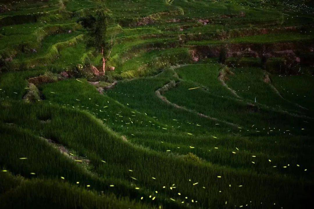沿着木栈道向梯田方向缓慢地移动,突然在栈道边,在梯田中正如管家说的那样出现了一闪一闪的萤火虫, 此起彼伏,这是我第一次见到萤火虫,兴奋的拿出手机拍摄,可惜因为数量不够,很难用镜头记录,管家说萤火虫最多的季节通常出现在7,8月,当稻子开始结穗的时节,并且还分享了之前的照片,方便我脑补画面。