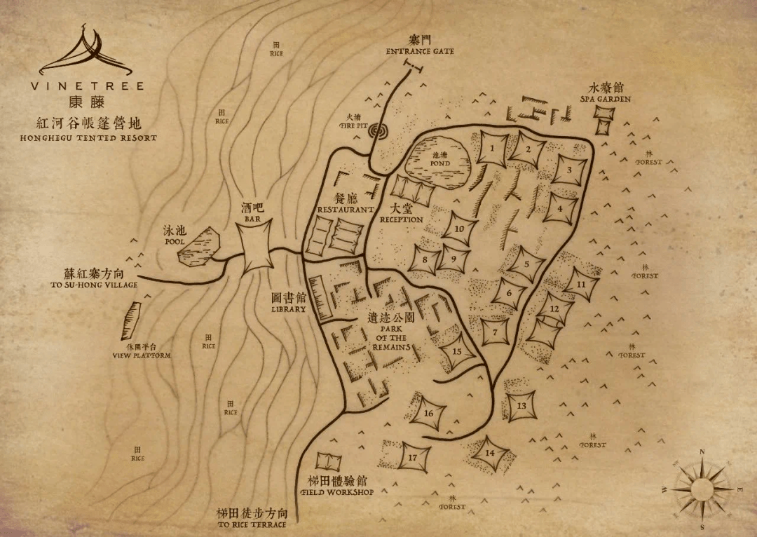 营地一共包含17间帐篷式院落,根据哈尼族文化,17间房又被分成了森林、水系、村寨和梯田四个不同的区域。17间院落一共包含4种房型, 分别是左能帐篷房,奎容帐篷房,瓦渣双帐和落恐组合帐。