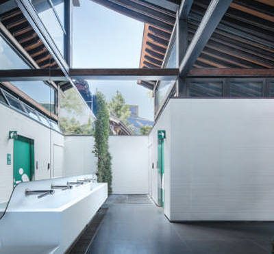 作为创意生态公厕,兰心公厕“融厕于景”的创意可见可感,而它的科技感和生态意识尤其值得细说:独立研发的“公厕大脑”自动调节光照、水电等能耗,过滤器可去除99.9%的细菌,零触感水龙头让洗手干手一步到位……在新材料应用方面,外墙水波状的粗糙纹理,实际上采用的是一种叫光触媒涂层墙面板的新型材料,可以有效吸收并分解厕所内排出的臭气。这种板材有污物粘在上面时,只要有阳光照射,污物就会自动分解,非常便于打理。