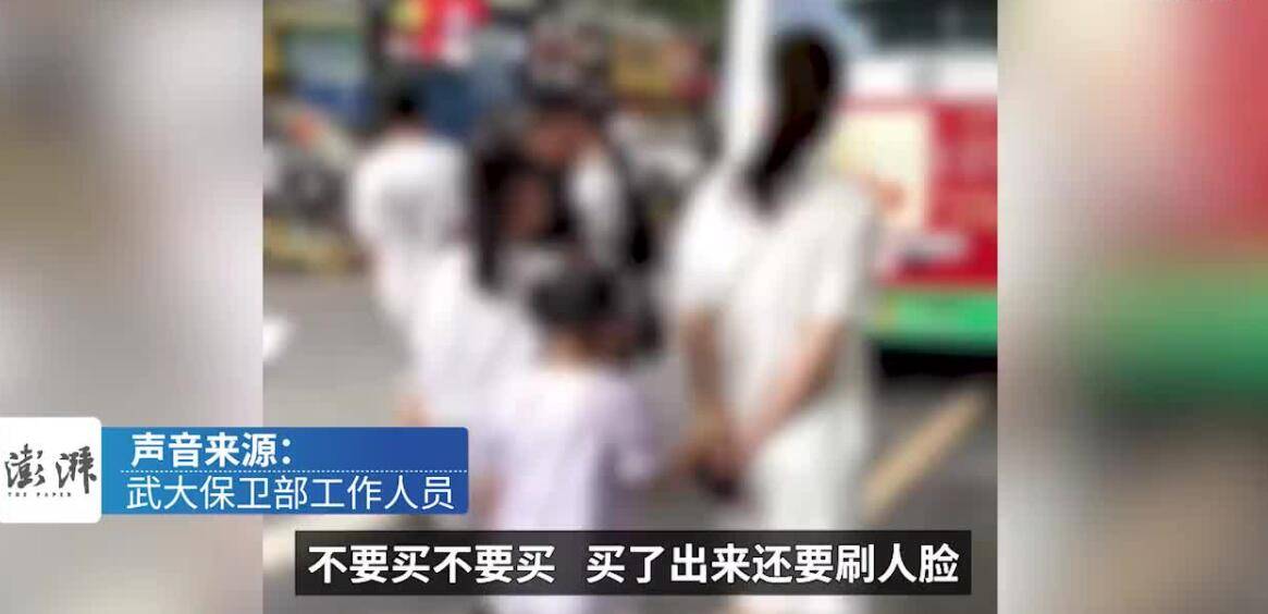 数十名保安、民警、志愿者等工作人员在游客参观通道处值守,维护着校门口的秩序。游客们都自觉站在警戒线内,有序等待校园开放。