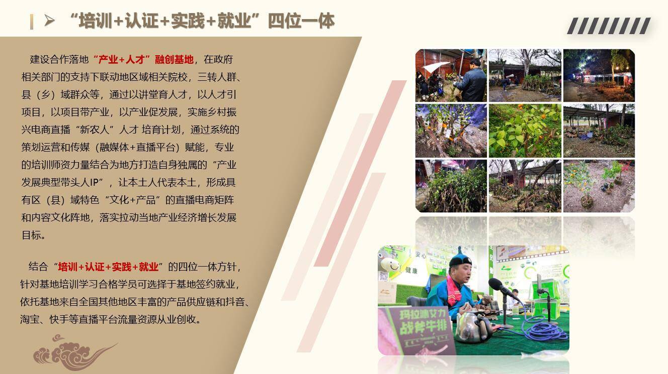 建设落地百城千企地方区(县)域智播基地,在政府相关部门的支持下联动地区域相关院校,三转人群、县(乡)域群众等,通过以讲堂育人才,以人才引项目,以项目带产业,以产业促发展,实施乡村振兴电商直播“新农人”、物流领域技能人才培育计划,通过系统的策划运营和传媒(融媒体+直播平台)赋能,专业的培训师资力量结合为地方打造自身独属的“产业发展典型带头人IP”,让本土人代表本土,形成具有区(县)域特色“文化+产品”的直播电商矩阵和内容文化阵地,落实拉动当地产业经济增长发展目标。