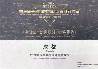 4月2日,由人民日报社旗下《环球时报》社主办的第三届环球城市招商引资推介大会在北京举行,同时发布了“中国城市美好生活新发展——中国城市投资吸引力指数报告”。成都位居“2022中国最具投资吸引力城市”第一名。成都东部新区获评“2022中国十大最具投资价值新区”、成都市青白江区和彭州市获评“2022中国投资环境质量十佳县(市、区)”、成都经济技术开发区获评“2022中国最具投资吸引力产业园区”,天府新区获评“2022中国最具投资吸引力新区”,可谓硕果累累。