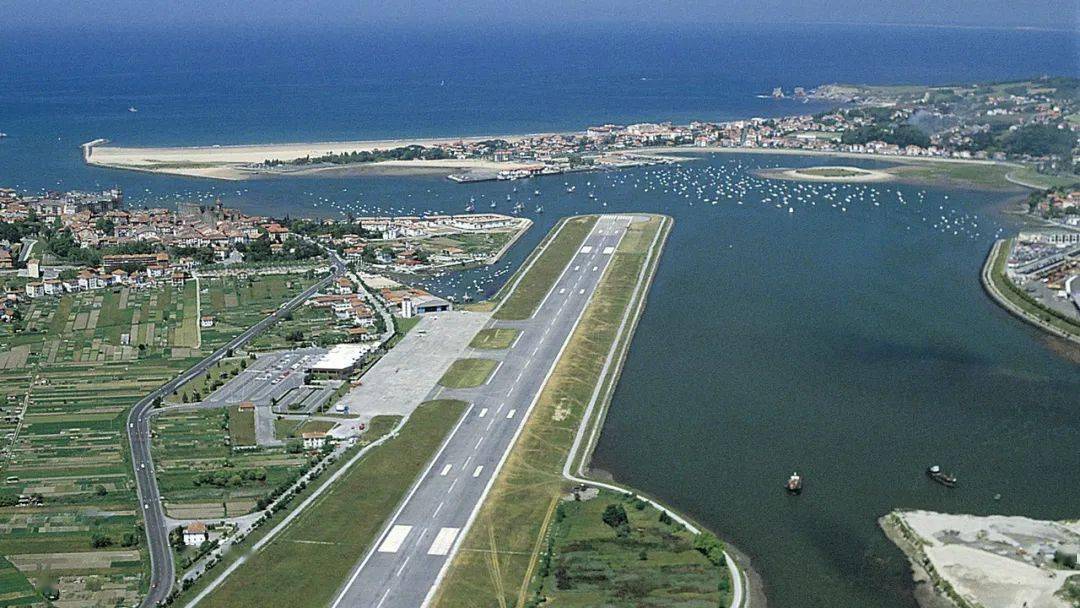 与南美多国“单向运行”边境机场不同,西班牙的圣塞瓦斯蒂安机场(EAS)借道法国。这座机场修建在边界河湾旁,向北起飞时基本上一抬轮就进入法国。