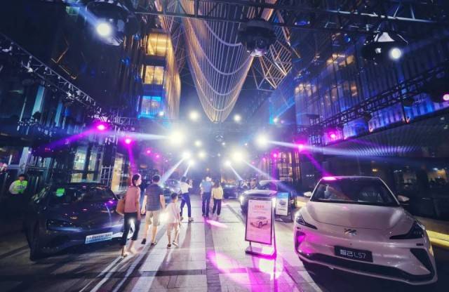 在周到帮忙购车区,电力十足的新能源汽车映射着五彩斑斓的灯光,许多汽车爱好者们在此驻足流连忘返。