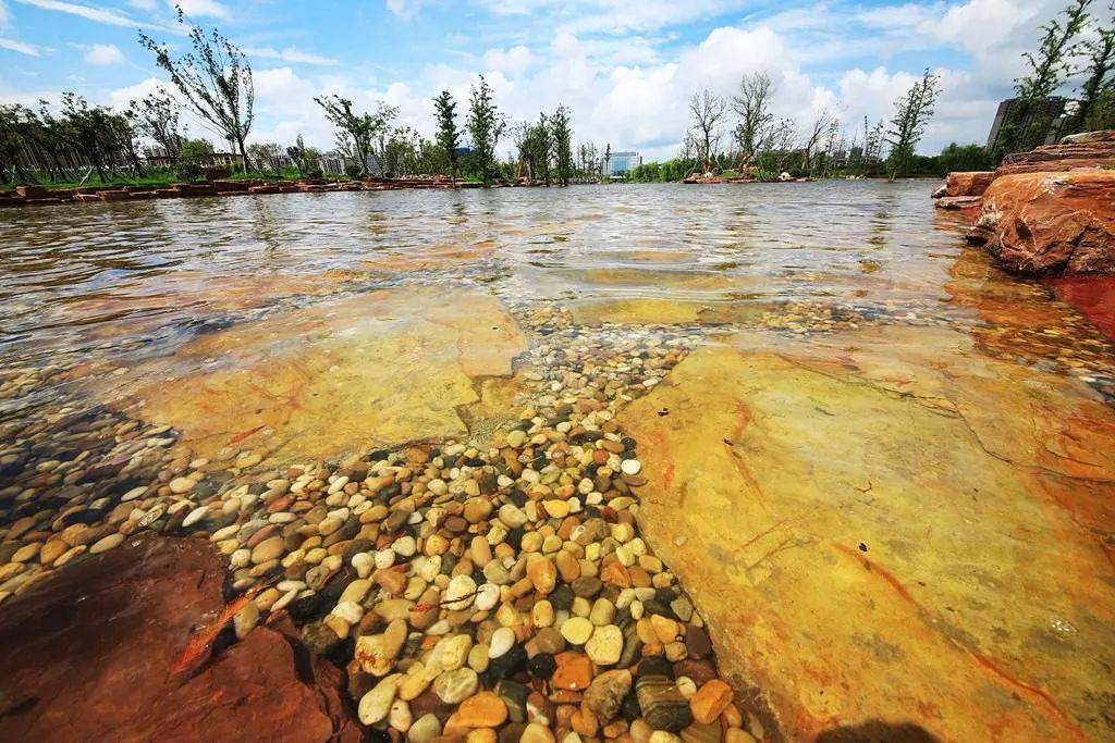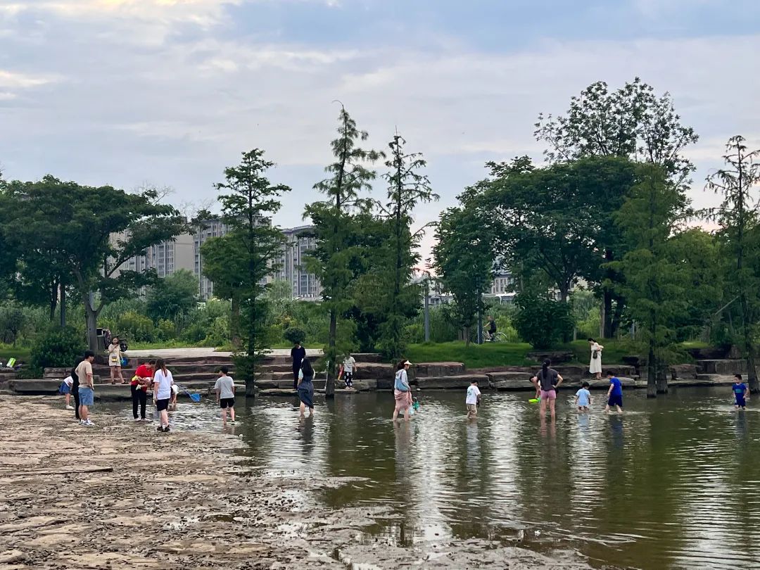 而乐水空间就在渡江路北侧、小桥港边上,活动空间1.1万平方米,是一处亲水、戏水场所。步入这里,一副江南水乡画面就在眼前,水面波光粼粼,间隔有水杉树造景,鹅卵石在水底清晰可见,整体水上空间开阔,可以赤足或穿着凉鞋下水娱乐。