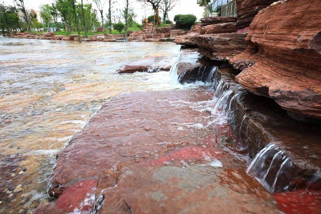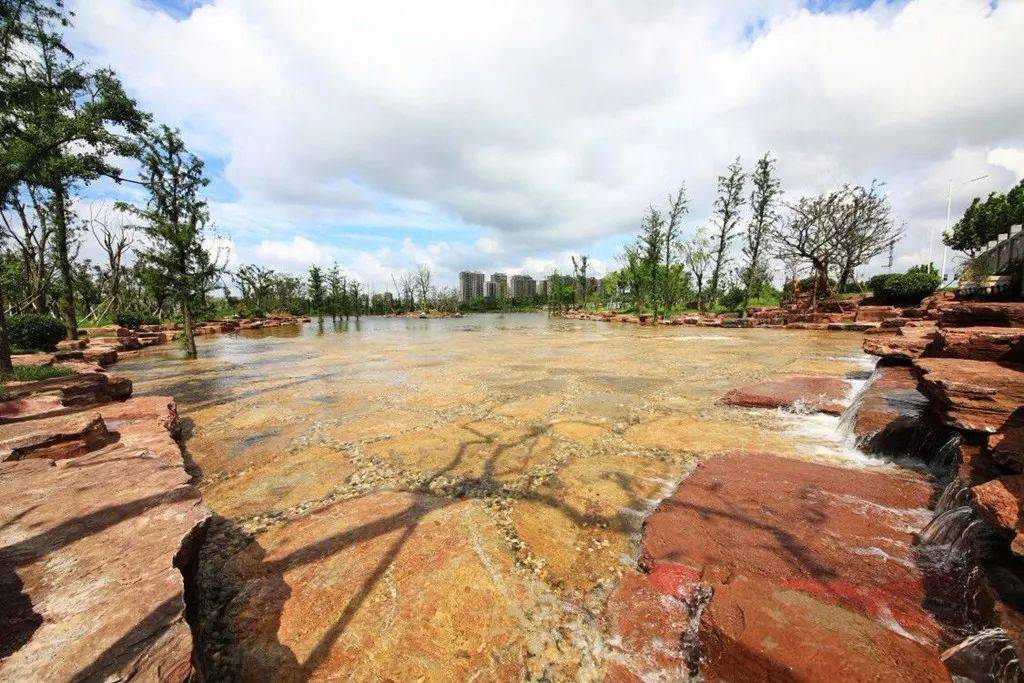 中间是较大的一片静水区域,也是大家可以娱乐的主要区域,底部是石块铺底的路,水位大概在脚腕位置高度,可以有较好的活动空间。此外还有缓冲地带,做好安全最后一关。东西两侧整体为千层石驳岸,选用表面平整、侧面无大锐角的千层石,保证在这里戏水的人的活动安全。