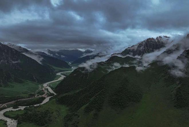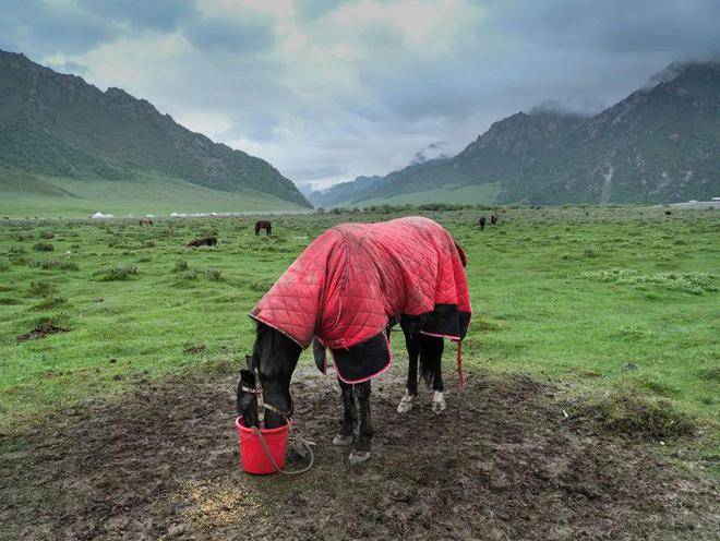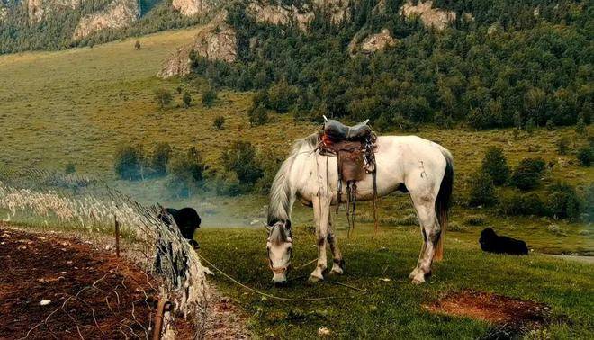 可能是见有车停在路边吧,两个牧人雨中骑马而至,一白、一棕,两黑两白四条狗跟随。近前,我们双方彼此好奇地打量问询,从哪来、到哪去,干什么的……他俩身穿雨衣雨裤,泛着水光,并不下马,手挽辔头,不时地抚摸一下马头,很有点像一位绿林好汉带着随从匆匆赶路的样子。他们在马上与我们聊了几句,指着身后树林掩映下的草原,说那边有他们的100多只羊。临别,送给他们摄影包里仅有的两块巧克力,他们也并不多言,只是把巧克力塞进嘴里,然后调头飞驰而去。目送他们打马远去,有片刻的恍惚,这样的邂逅场面,仿佛武侠小说里的场景,而在这样人迹罕至的高山河谷间亲身经历了——可能也只有在这样风景优美的原始之地才能偶遇吧!打量聊天和恍惚中、匆忙之间,也怕惊扰了这美丽神奇的邂逅,一直没有举起相机,只来得及用手机拍了两张照片。