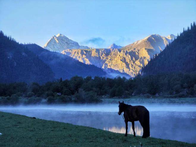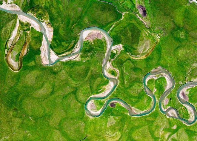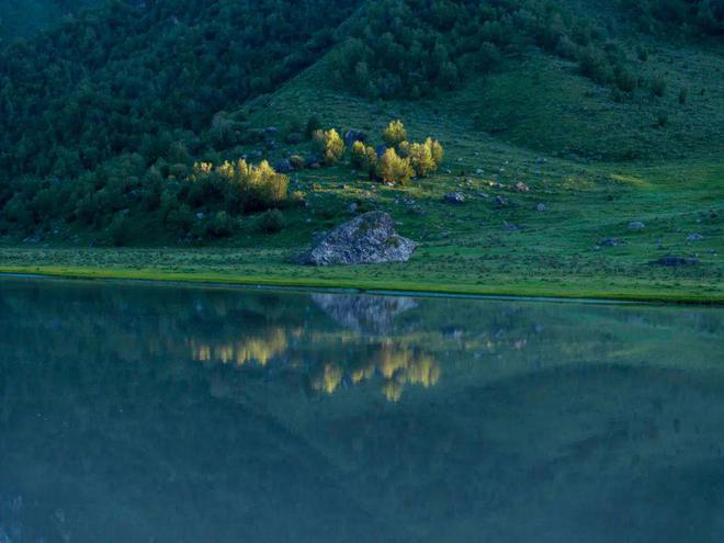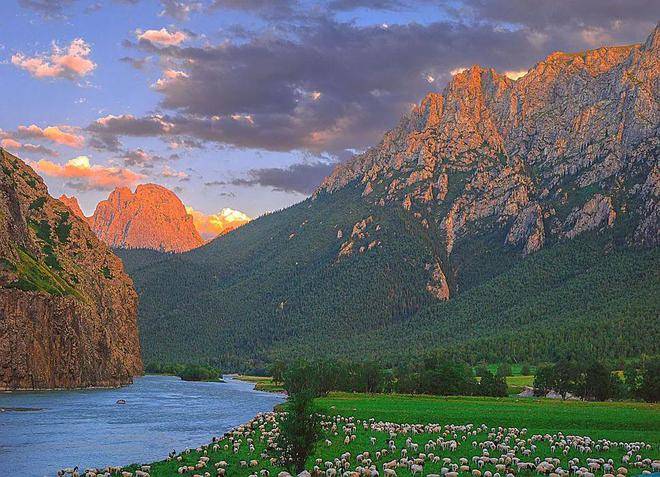 赛罕陶海不愧是“美丽的河湾”,从“鹿鸣湾”开始,四个大河拐弯处壮美如画,河岸线曲折,植被茂密,小巧玲珑的河洲如绿色舟楫静静休憩。这里是南疆母亲河开都河(又称通天河,据说是《西游记》里那条著名的河)上游,及其众多支流,青绿、蓝绿、深绿,不同深浅、各种形状的水流水域,如网密织。如天山山脉和草原的血脉,滋养着万物生灵。花草从中,山林间,绿洲旁,马鹿、狍鹿、野猪、旱獭、鹰隼、灰鹤等各种野生动物,与散居的牧民和平相处;马牛羊群,宁静地在山坡上吃草。晨雾在山间缭绕,河流上也隐约升起一条巨长的哈达,山形与河面忽隐忽现,山河依偎,宛如仙境。太阳升起,云飘云游,你追我赶,聚散依依,云下牛羊吃草,下了这坡,又上那坡。倏忽之间,又见暮归的牧人策马扬鞭,哨声响亮又温柔;蒙古包里已升起炊烟,与天边的霞光相映,一派静谧安闲。不久,暮色四合,峰峦如黛,唯雪山依稀可见。河流之上,又升腾起雾霭如练。夜深了,两三只牧羊犬也钻到干牛粪堆旁睡着了,草间有露水慢慢浸上来。到凌晨,每一片草叶都被白霜包裹了,黎明时分,凌凌地伸展着倔强和坚强,而蒙古包里,炉火尚热,睡梦正酣。