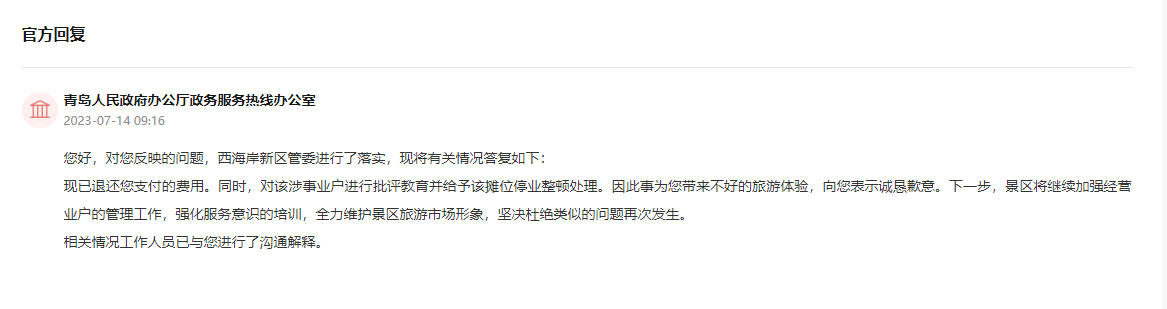 对此,青岛人民政府办公厅政务服务热线办公室7月14日回复称,“现已退还您支付的费用。同时,对该涉事业户进行批评教育并给予该摊位停业整顿处理。因此事为您带来不好的旅游体验,向您表示诚恳歉意。”