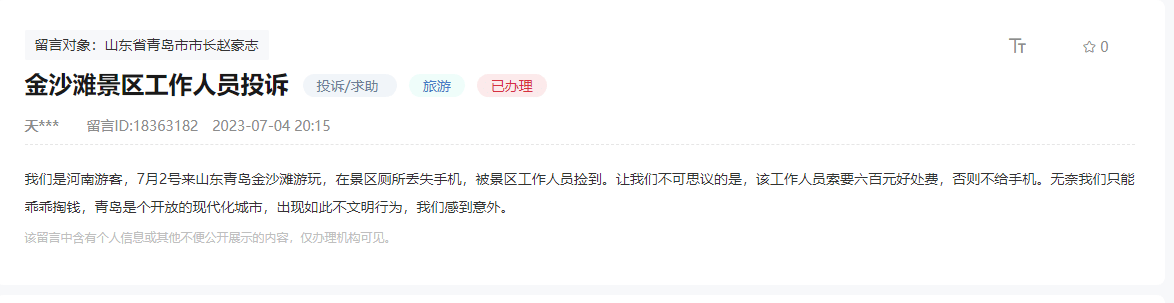 7月4日,这位网友在“领导留言板”留言称,“我们是河南游客,7月2号来山东青岛金沙滩游玩,在景区厕所丢失手机,被景区工作人员捡到。让我们不可思议的是,该工作人员索要六百元好处费,否则不给手机。无奈我们只能乖乖掏钱。”