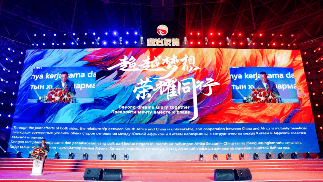 2023年7月16日,“超越梦想,荣耀同行——和治友德启航中国七周年庆典”在天津市宝坻体育馆隆重举行。南非共和国驻华大使谢胜文出席本次活动并致辞。