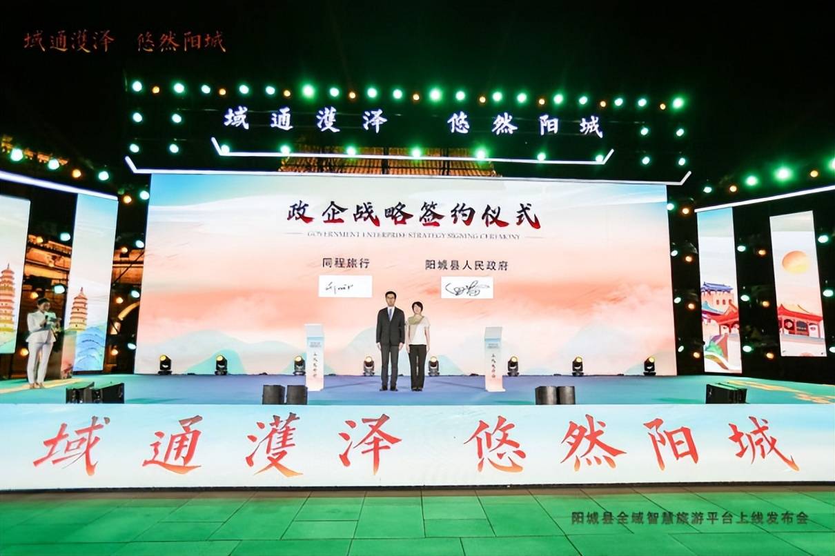发布会现场,同程旅行目的地事业部商务总监刘成伟与阳城县人民政府进行政企战略签约,同程旅行华北区门票商务总监刘洋与郭峪古城、析城山景区进行文旅企业战略签约,多方携手并进,共同打造阳城文旅新名片。