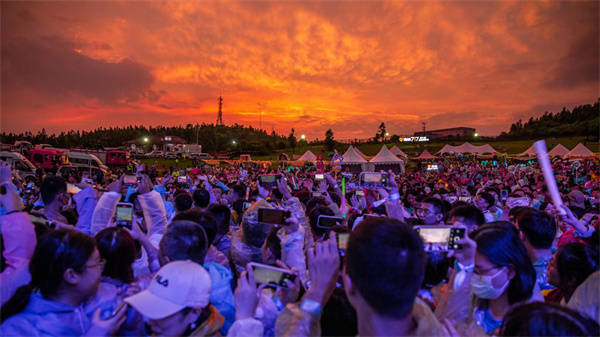 晚霞的色彩是火艳的,而音乐节的现场是热烈的,在音乐的感染下,游客们尽情在音乐的海洋中摇摆,这是一场阔别已久的音乐狂欢盛宴。鼓点如潮头而来,激情的电音震动心弦,电音的声浪、摇滚的音符响彻整个草原。