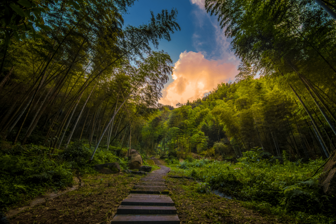 幕阜山居看云,一步一风景,沿着山居背后的竹林小道往上漫步,白云与翠竹交相辉映,耳边是哗啦啦的山泉流泻的声音,一时间,远处的云,近处的竹,林边的泉,山中的笋,邻家的狗,半腰的房,诸多形态,构成了一幅雅致的幕阜山居图。