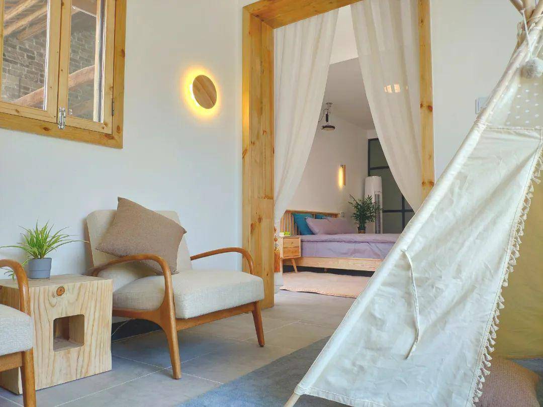 整处民宿原是由一个古朴的院子改造而成,民宿主人将残缺破损处运用自然材质稍加修理,竹片围成篱笆,屋基改造成泳池,再放上秋千摇椅,保存了民宿特色的同时更加方便居住。