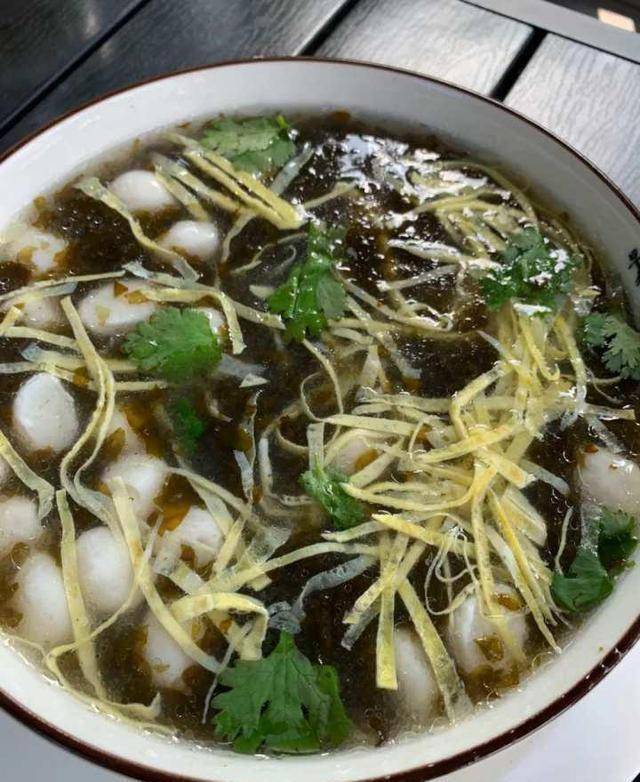 汤里的地衣则是每次下雨之后,厨师去山脚、路边采集回来的。鲜嫩幼滑的小鱼圆与地衣一起入汤烧煮,勾芡后加入蛋皮、香菜,色泽亮润诱人,汤汁清爽鲜美,只要上桌很快就被一扫而光。