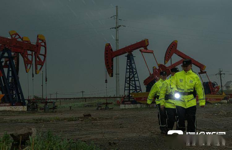 《应对强降雨大风天气》2023年7月10日,山东省东营市出现短时强降雨和大风天气。东营市公安局海岸警察支队东海海岸派出所民警到辖区油田作业点、盐田和郊荒地带巡逻,排查“四闲场所”安全隐患。陈镜旭 摄