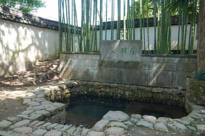 陆羽泉已有 1200 多年历史,有参天古樟依伴,泉分两口,一大一小,大井中水用于洗滁,小井中水用于泡茶。泉旁青石上锩刻由当代书法泰斗沙孟海先生书写的“陆羽泉”三字。