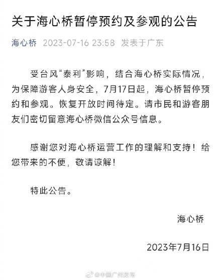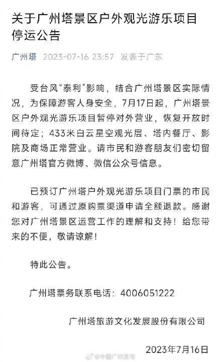 受台风“泰利”影响,结合广州塔景区实际情况,为保障游客人身安全,7月17日起,广州塔景区户外观光游乐项目暂停对外营业,恢复开放时间待定;433米白云星空观光层、塔内餐厅、影院及商场正常营业。请市民和游客朋友们密切留意广州塔官方微博、微信公众号信息。已预订广州塔户外观光游乐项目门票的市民和游客,可通过原购票渠道申请全额退款。此外,7月17日起,海心桥暂停预约和参观,恢复开放时间待定。请市民和游客朋友们密切留意海心桥微信公众号信息。(广州塔、海心桥)