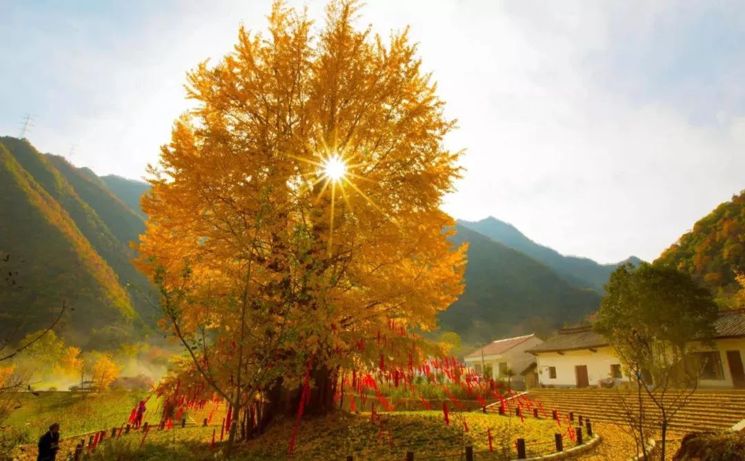 在玉皇庙镇玉皇庙村的入口处,还会偶遇一颗四千年的古银杏,初秋时节,巍然耸立,绚丽又灿烂。