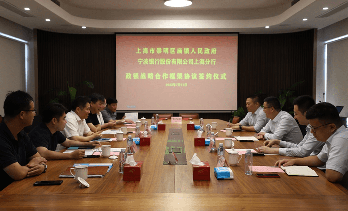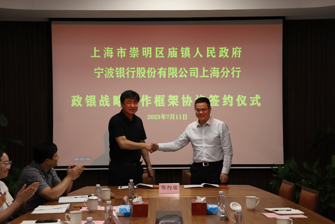 7月11日下午,宁波银行上海分行与上海市崇明区庙镇人民政府举行战略合作签约仪式。宁波银行上海分行党委书记、行长徐雪松,宁波银行上海崇明支行行长程凯峰,崇明区庙镇党委书记陈建飞,党委副书记、镇长陆飞,党委副书记戴兵等参加。