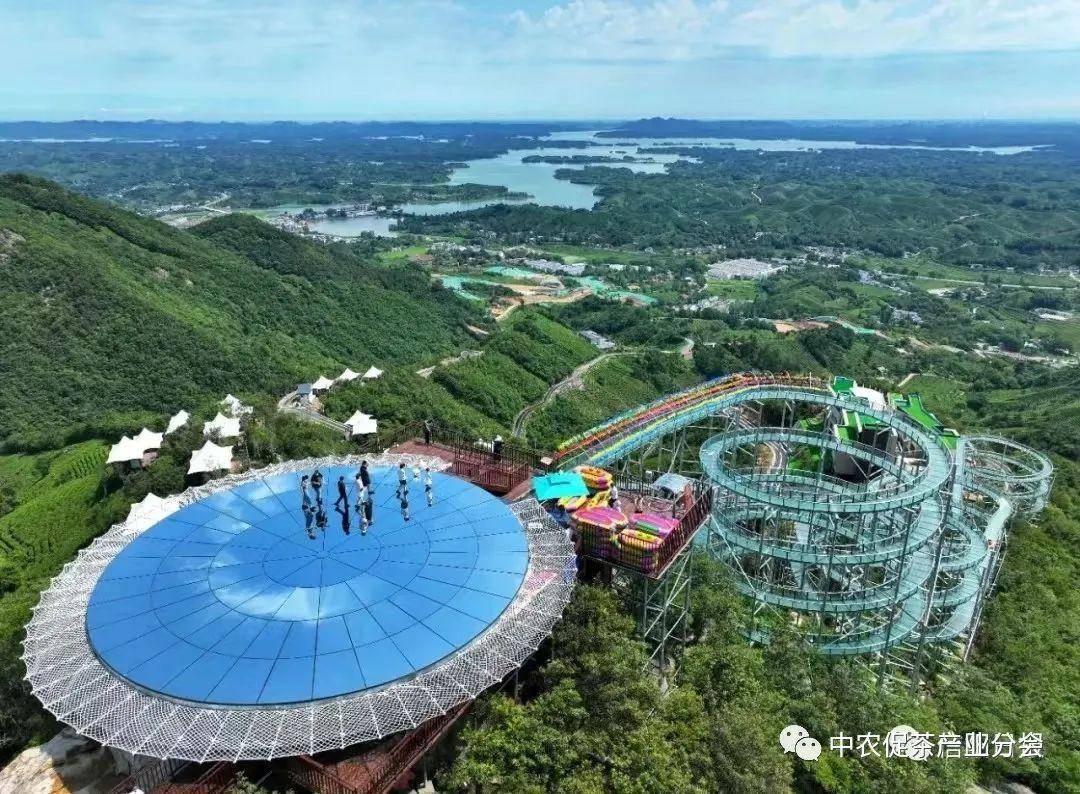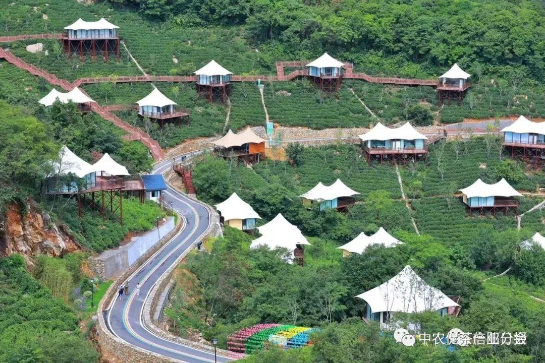 在天空之镜拍照打卡后,乘坐玻璃水滑道螺旋盘绕而下,蜿蜒于密林之中,仿佛空中漂流一般,惊喜与刺激并存,溅起挡不住的清凉,乘坐景区观光车经蜿蜒山路到达山顶,俯瞰茶山,何家寨露营基地里,一个个白色的帐篷酒店散落山间,正如朵朵茶花盛放的姿态。