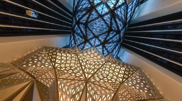 摩珀斯酒店以玉饰为设计灵感,是全球首座采用自由形态外骨骼结构的摩天大楼,建筑中央的镂空部分以“8”字为设计概念。要实现这个建筑结构,其所消耗的钢材量总和超出用以建造巴黎铁塔锻铁的四倍。