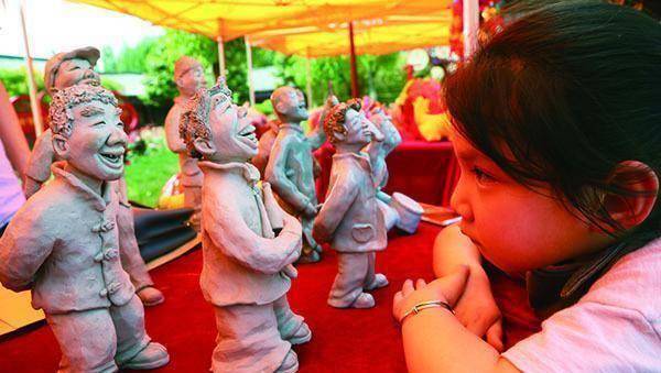 在中华曲艺展览馆内,汝瓷、泥塑、刺绣、微雕等非遗作品一字排开,迎接着远方的游客。