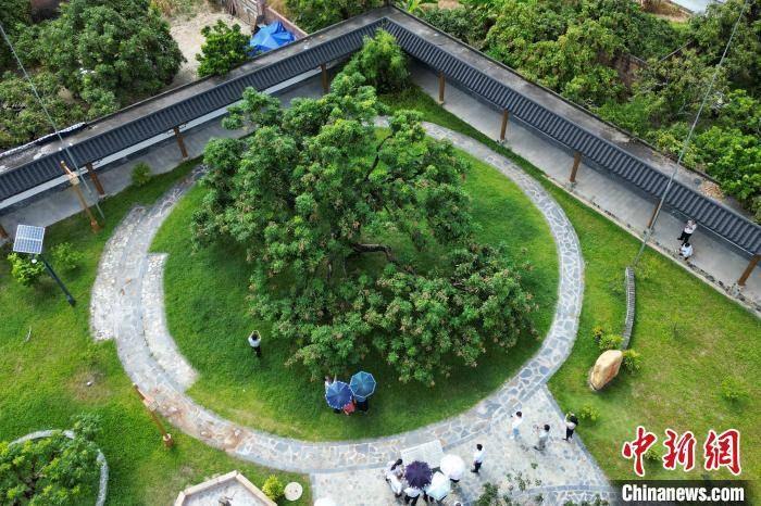 高州市分界镇储良村,有百年历史的储良龙眼母树硕果累累,吸引参观者。(无人机照片) 陈楚红 摄