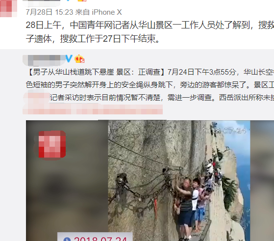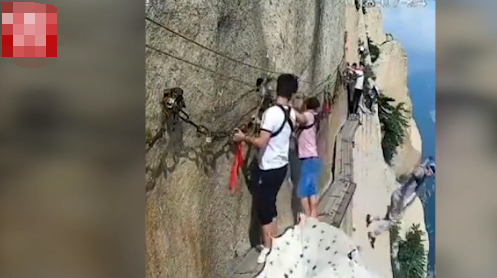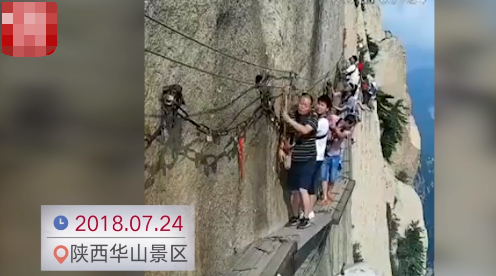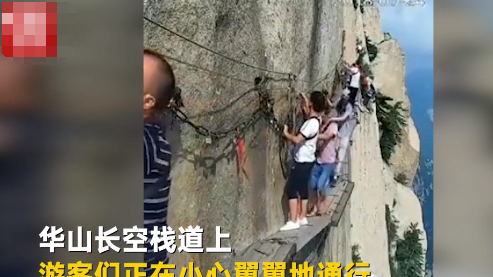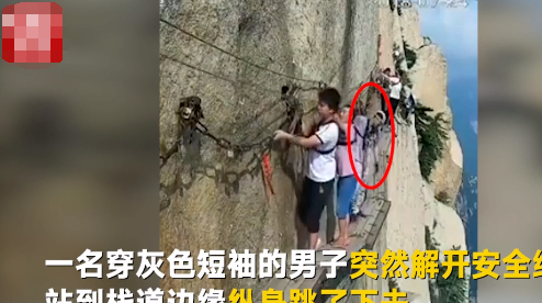 这件事发生在不久前的华山景区,著名的长空栈道吸引着无数的游客前来冒险。事故就发生在画面中这一群人的队伍里,一个男子突然就解开安全绳索,双手一扬跳入悬崖。