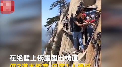 在悬崖峭壁上依崖凿出栈道,仅仅三道木板宽,而且只能容一人通行。