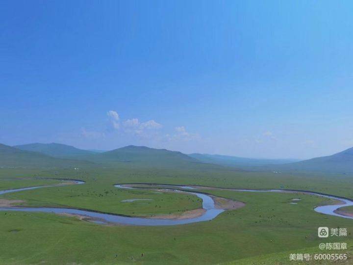 进入腹地。抬眼望去:湛蓝的天空,飘荡着片片白云,肥腴的沃土,风卷绿浪,碧波万顷。源于大兴安岭西麓,由涌泉汇集而成的莫尔格勒河是呼伦贝尔大草原的上的一颗璀璨明珠,被著名作家老舍先生形容为“天下第一曲水”,流水清澈而平缓,四季流量变化不大,恰似绸带般轻盈飘逸。滋养着广袤无垠的草原。众多的游客,欢呼雀跃,摆拍留影,小外孙在草原上玩耍足球,左闯右拐,颠球,运球、长传……玩得不亦乐乎。