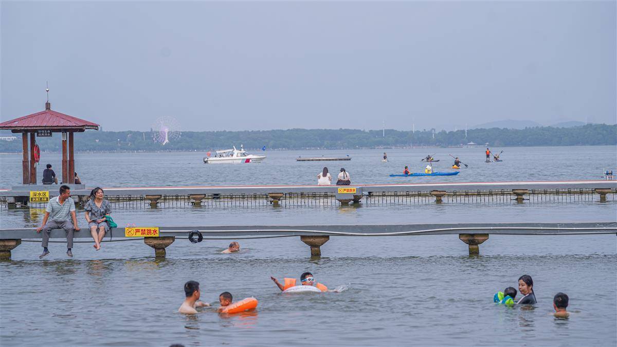 “小时候娱乐项目不多,记忆最深的就是每年夏天,父亲骑着自行车带我来东湖游泳,一下水清清凉凉,瞬间消了暑气。”下午4点,听涛泳场水面已是一番热闹的景象,游客岳震铎带着孩子在岸边热身,他笑眯眯地告诉记者,“今天带孩子来游泳,主打的是一个‘情怀’。这些年,东湖游乐项目越来越多,城市绿心成为了人民乐园,市民游客玩得不亦乐乎,这片湖泊也在继续收集着新一代人的快乐记忆。”