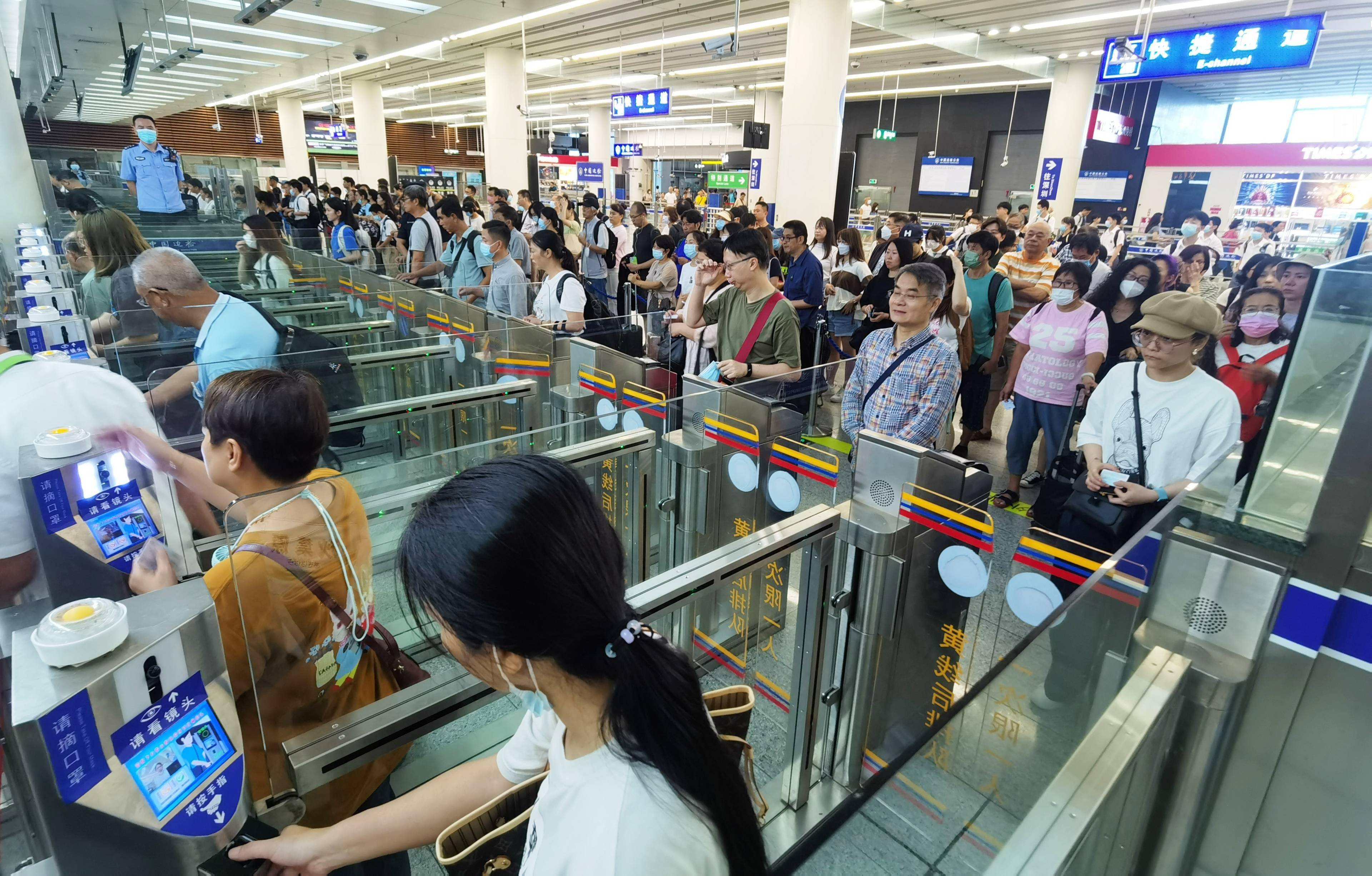据皇岗边检站相关负责人介绍,随着国家移民管理政策持续优化调整、7月1日“港车北上”正式实施和暑期等多重因素影响,福田口岸因交通便利、快捷高效的通关环境,成为众多出入境旅客往来深港的首选通道。每天旅客络绎不绝,以商务贸易、跨境探亲、旅游休闲、研学交流等为主的出入境客流始终处于稳步上升趋势。