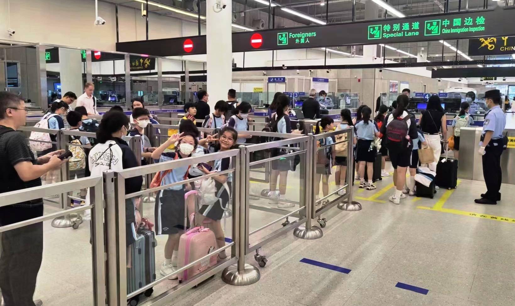 前往内地游学的香港儿童兴高采烈地经皇岗口岸入境。江勇摄