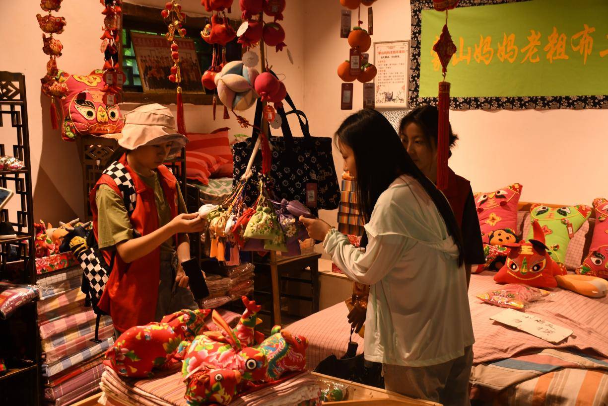 随后实践团去往了“蒙山妈妈的老粗布”,这是一处店面,里面的粗布制品琳琅满目,经过店长介绍我们了解到,蒙山妈妈粗布的家纺产品有300多种,都是沂蒙山红嫂的后人自己设计手工缝制的。店里挂着的、摆着的,有孩童的小鞋,有布老虎,有针脚精致的香囊。这里的一针一脚都衲入了竹泉村的农家风情,一线一布都织出了沂蒙的最美景色。